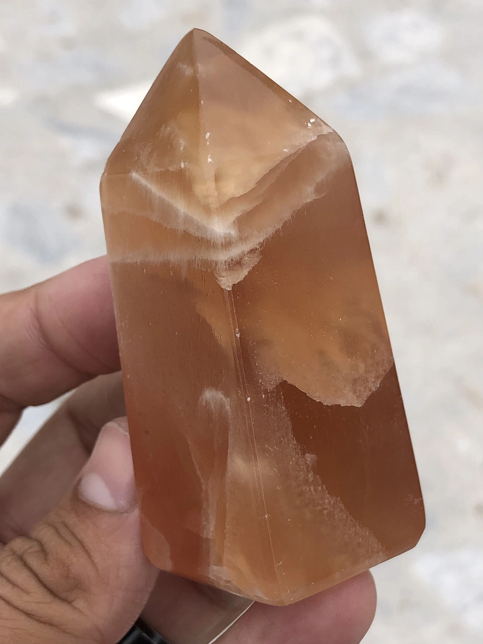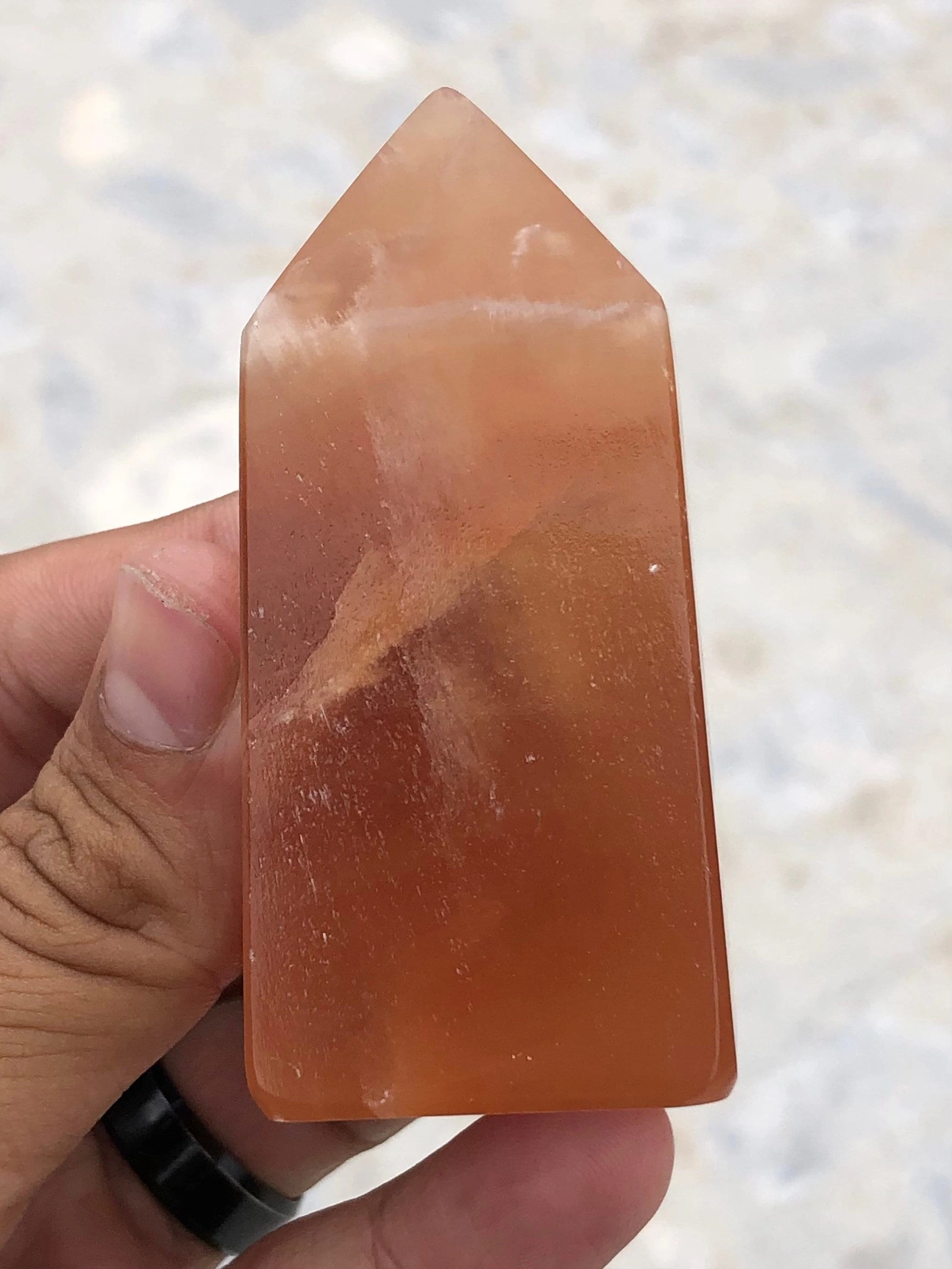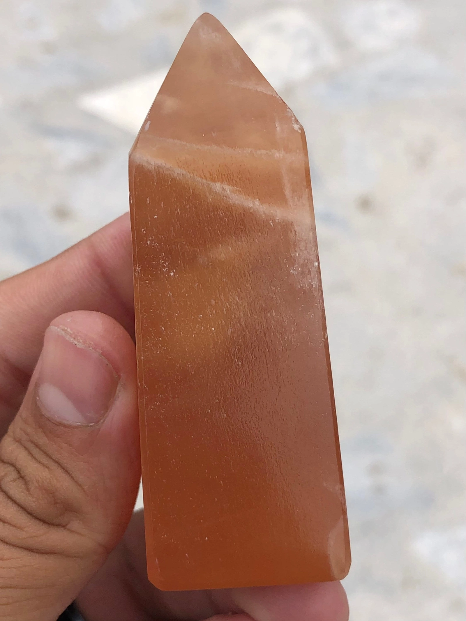 A Calcite Tower is a beautiful and striking crystal formation known for its smooth, polished surface and unique, transparent to translucent appearance. Calcite comes in a wide range of colors, including clear, white, orange, yellow, green, blue, and even pink, with each variation holding different metaphysical properties. The tower shape accentuates the natural crystalline structure, with the pointed top symbolizing heightened energy flow.